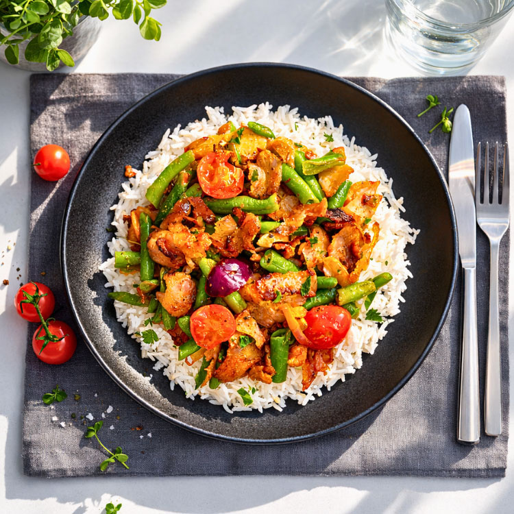 Ontdek de mediterrane keuken met een Turkse twist in deze smaakvolle en gezonde kant-en-klaar maaltijd. Dit gerecht combineert malse chicken döner met rijst, boontjes, paprika en ui, rijk gekruid met aromatische specerijen zoals paprika, komijn, knoflook, oregano, tijm en een vleugje cayennepeper. De kruidige smaak en verse ingrediënten zorgen voor een heerlijke en gevarieerde maaltijd.