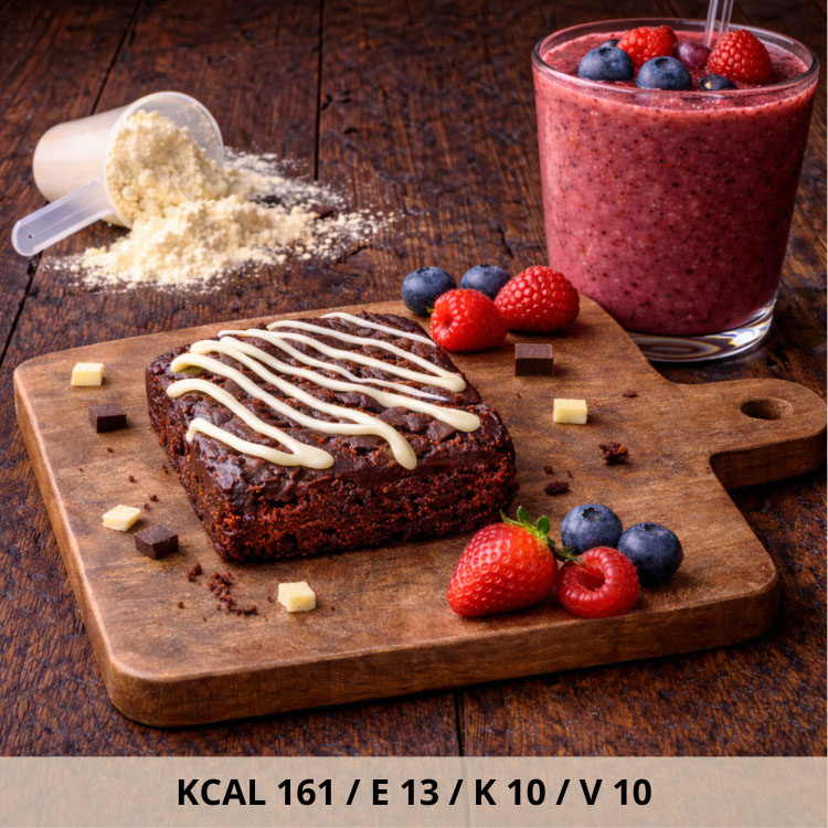 Onze eiwitrijke brownie met witte chocolade topping is de perfecte snack voor wie gezond wil eten maar ook wil genieten. Met 15 gram eiwit per brownie is dit een ideale fitness snack voor sporters en mensen die bewust met voeding bezig zijn.